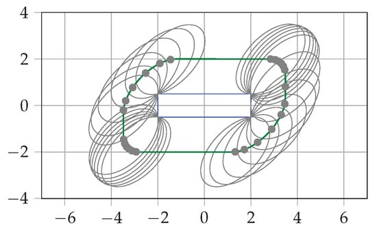 Leveraging the additivity of support functions, a commonly studied family of ellipsoids guaranteed to contain the Minkowski sum of a collection of ellipsoids with covariance matrices can be constructed. An ellipsoid within this family is parameterized by a vector , with its covariance matrix given by [29,30,31]:
