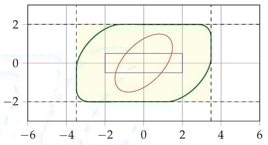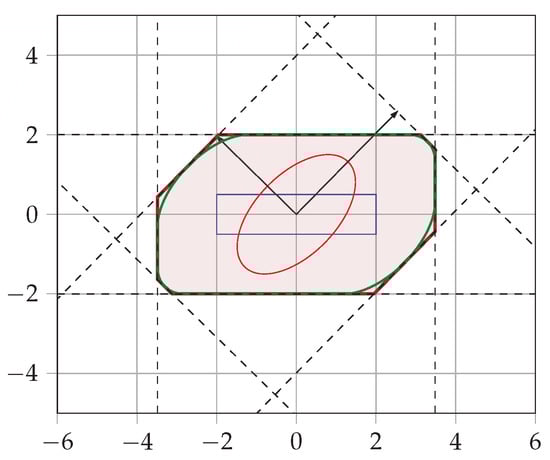 Our approximation relies on constructing two tight bounding boxes, and . The key tool for determining the minimal size of a bounding box that encloses in any given direction is the support function of the Minkowski sum . Using the additivity property (Equation (4)), the support function of the ellipsoid (Equation (5)), and the support function of the box (Equation (6)), we derive the following: