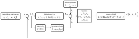 The overall structure of the proposed AFHSM control scheme is illustrated in Figure 2. It summarizes the integration of desired trajectory generation, SM control, adaptive fuzzy estimation, and torque saturation handling within the AMR dynamic model. This architecture highlights how the designed control components collaboratively ensure robust and accurate trajectory tracking under uncertainties and external disturbances.