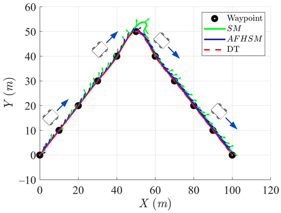 In this study, two distinct simulation scenarios were implemented to evaluate and compare the trajectory-tracking performance of the SM control method and the proposed AFHSM control method. The DTs in these scenarios consisted of a triangle-shaped trajectory and a convex-shaped trajectory, which were selected to assess the robustness and accuracy of both control methods under different conditions. The specific configurations of the DT waypoints and the initial conditions of the AMR for each scenario are provided in detail in the subsequent sections. Additionally, a comprehensive comparison of the simulation results is presented, highlighting the performance differences between the two control methods in terms of their trajectory-tracking accuracy and robustness to disturbances. These results will be analyzed to draw conclusions, demonstrating the effectiveness and advantages of the AFHSM method over the SM control method in handling trajectory-tracking tasks.