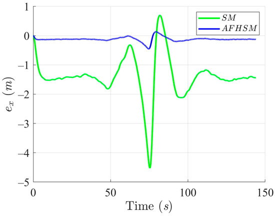 X-axis trajectory-tracking errors using SM and AFHSM control methods in scenario 2.