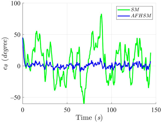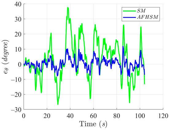 Heading angle, , trajectory-tracking errors using SM and AFHSM control methods in scenario 2.