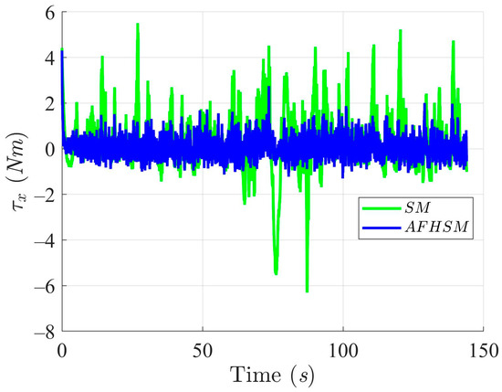 X-axis trajectory-tracking torques with SM and AFHSM control methods in scenario 2.