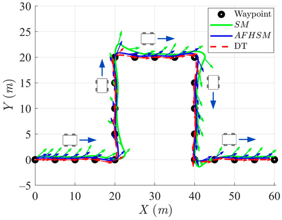 In this simulation, a DT was generated using 11 waypoints, as detailed in Table 3. Once the desired trajectory was defined, the controlled AMR utilized both the SM and adaptive AFHSM control methods for trajectory tracking. The DT consists of two straight segments and one smooth turn and is designed to evaluate the performance of the SM and AFHSM control methods in trajectory tracking. The initial conditions of the controlled AMR used in scenario 1 are provided in Table 4.
