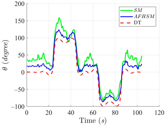 Trajectory-tracking performance of the DT at an angle, , with SM and AFHSM control methods in Scenario 2.
