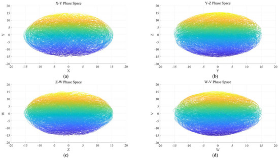 where denote system parameters. This hyper-chaotic system manifests five Lyapunov exponents (), specifically comprising two positive exponents with the total sum of all five exponents equaling zero. This property mathematically verifies the system’s Hamiltonian conservative nature, where energy preservation occurs despite its hyper-chaotic dynamics. The coexistence of pseudo-randomness and exceptional complexity, as demonstrated by the two positive Lyapunov exponents and five-dimensional phase space, establishes this system as a paradigm of conservative hyper-chaos. Visual evidence of its chaotic attractor structure is provided in Figure 1, showcasing the system’s non-repeating yet energy-bound trajectory patterns.