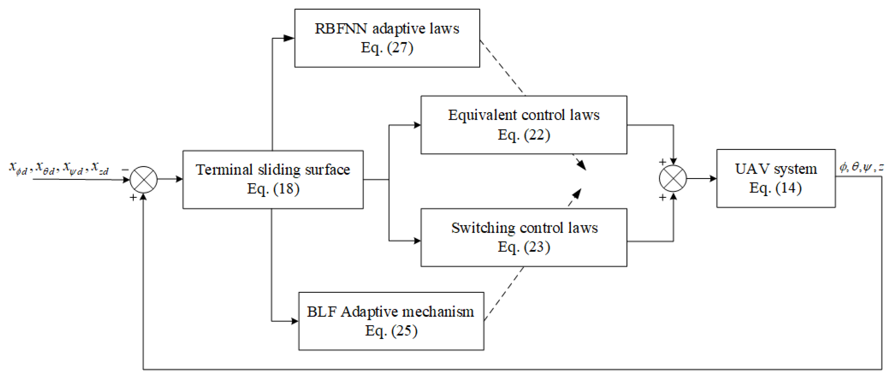 Sliding mode control (SMC) has emerged as an effective approach due to its strong robustness against uncertainties [9,10,11,12,13,14]. To tackle the challenge of quadrotor UAVs’ high sensitivity due to small moments of inertia and external disturbances, a synthesized SMC approach has been introduced [15]. This method integrates a novel adaptive law, improving convergence speed and robustness while efficiently mitigating external disturbances. In [16], to address the challenges of implementing adaptive SMC in quadrotors for real-world scenarios, a complete control architecture was proposed. In [17], to address the challenges of model uncertainties and unknown external disturbances in quadrotor UAVs, an event-triggered control technique based on adaptive barrier function higher-order global SMC was proposed. This approach aims to extend the sampling interval of control signal updates while ensuring system stability and improving overall efficiency. Building on fuzzy control’s well-documented capability for uncertainty handling [18], an innovative neuro-fuzzy sliding mode control scheme specifically designed for quadrotor UAV systems was introduced in [19]. However, conventional SMC methods may suffer from chattering and sensitivity to unknown dynamics, which can degrade overall control performance [20,21], this motivated us to conduct further research.