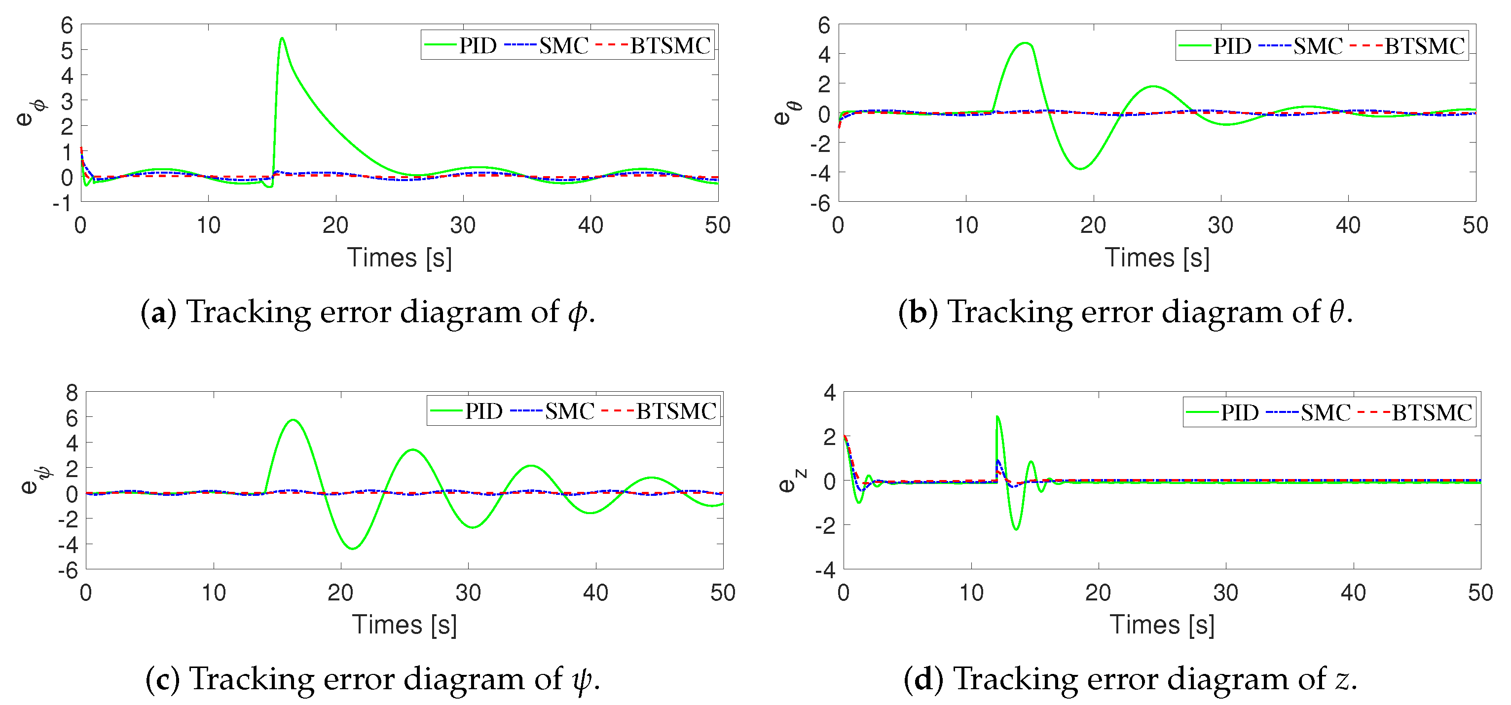 Secondly, for the sinusoidal tracking experiments in Figure 7 and Figure 8, the BTSMC controller also demonstrates superior tracking performance under complex dynamic tracking tasks. Compared to PID, which exhibits significant phase lag and steady-state errors, and SMC, which still suffers from latency issues, BTSMC ensures smoother trajectory tracking while maintaining system stability. The RMSE of tracking errors are displayed in Table 3. Comparative analysis of the tracking error RMSE under three control strategies demonstrates the superior performance of BTSMC. For the attitude angles , , and , the BTSMC errors (0.05263, 0.05235, 0.00685) are 56.4–94.0% lower than those of SMC (0.12071, 0.12393, 0.11346) and over 95% lower than those of PID (1.16690, 1.44250, 1.94510). In altitude z control, BTSMC (0.19168) still achieves the lowest error, highlighting its stability advantage, particularly in dynamic tracking tasks. Moreover, as shown in Figure 10 and Figure 11, under external disturbances, BTSMC maintains strong disturbance rejection capability, enabling the system to closely follow the desired trajectory, whereas both PID and SMC exhibit larger deviations. In summary, the simulation results fully validate the advantages of the proposed BTSMC control strategy in improving tracking accuracy, enhancing robustness, and suppressing chattering, demonstrating its effectiveness and superiority in quadrotor attitude control.