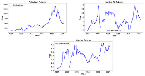 In this article, we analyze monthly data covering the period from January 2004 to September 2024, making a total of 249 observations. Specifically, we focus on the futured prices of three commodities: palladium, heating oil, and copper (all extracted from www.investing.com, accessed on 28 October 2024). The economic and financial significance of palladium, heating oil, and copper, when considered collectively, is both substantial and strategic, with relevance in multiple dimensions. Each of these commodities plays a distinct role in global markets, but their combined value becomes even more pronounced when viewed through the lens of industrial, energy, and technological development.