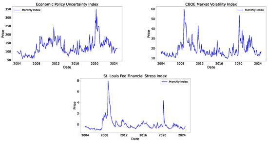 Unlike spot prices, futures prices offer more accurate forecasts by accounting for inflation and effectively reflecting the influence of supply and demand dynamics on commodity prices (for details, see [25,26]). Additionally, we examine three indices: the Economic Policy Uncertainty Index (EPUI) (https://www.policyuncertainty.com/us_monthly.html, accessed on 28 October 2024), the Volatility Index (www.investing.com, accessed on 28 October 2024), and the St. Louis Fed Financial Stress Index (https://fred.stlouisfed.org/series/STLFSI4, accessed on 28 October 2024).