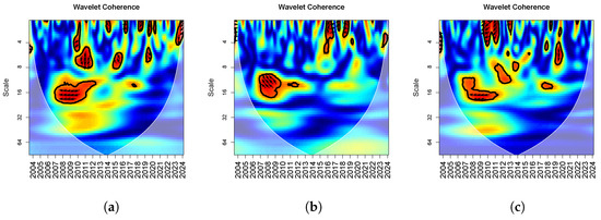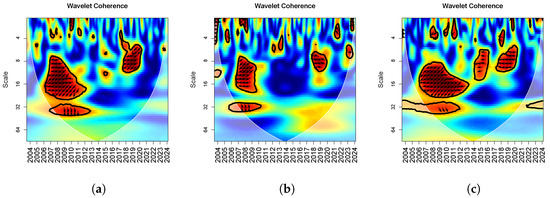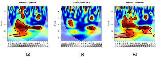 The wavelet coherence ranges from 0 to 1 and measures the local correlation between two time series at a given location and scale . A value close to one indicates a strong linear relationship and significant comovement, while a value of zero suggests the absence of a linear relationship, potentially indicating nonlinear dynamics (for other details, see [32,33]).