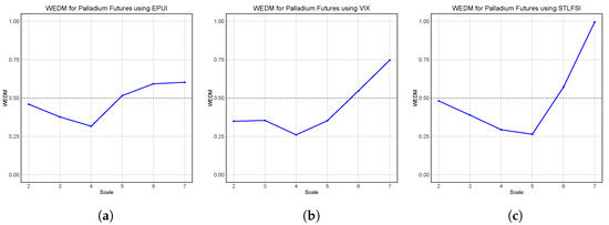 We can draw a parallel between these results and the wavelet coherence analysis from Section 5, which explored the relationships between palladium and the financial indices studied. While coherence identifies correlations across time scales, WEDM measures predictive power, offering a distinct perspective. The EPUI emerges as the most stable predictor of palladium, maintaining low WEDM values, aligning with its medium-term coherence, where palladium led the EPUI. The VIX shows fluctuating predictability, reflecting its unstable, short-term correlations. Despite the STLFSI exhibiting persistent negative coherence with palladium, its high WEDM values indicate a weak forecasting ability, reinforcing the notion that correlation does not always imply predictability.