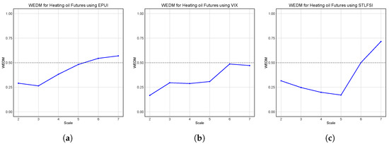 In contrast, the STLFSI (Figure 8c) initially has lower WEDM values, similar to the VIX, but these increase rapidly after scale 5, reaching values close to 0.75 at the largest scale. This suggests that financial stress is a weak predictor of heating oil’s futures price, particularly in the long run. While the STLFSI shows some informativeness at short scales, it loses its predictive ability at larger scales.