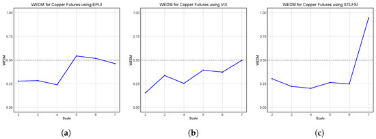 The STLFSI (Figure 9c) exhibits a distinct pattern, where its WEDM values remain low at smaller scales but increase sharply after scale 6, reaching values close to 1. This indicates that financial stress has little to no predictive power for copper futures in the long run, as high WEDM values suggest weak explanatory ability. However, for scales 3–6, the EPUI exhibits the lowest WEDM values, indicating that it has the strongest predictive power for copper’s futures prices in this range. Its relatively low values at small scales imply that the STLFSI may still have some relevance in terms of predicting short-term copper price movements, even though it loses significance over longer time horizons.