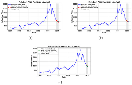 Palladium futures prices predicted using LSTM. The red dotted line represents the predictions. The shadowed region denotes the period covered by the forecast. (a) Forecasting palladium using the EPUI. (b) Forecasting palladium using the VIX. (c) Forecasting palladium using the STLFSI.