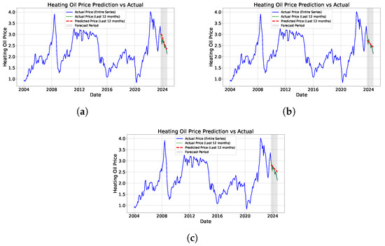Heating oil futures prices predicted using LSTM. The red dotted line represents the predictions. The shadowed region denotes the period covered by the forecast. (a) Forecasting heating oil using the EPUI. (b) Forecasting heating oil using the VIX. (c) Forecasting heating oil using the STLFSI.