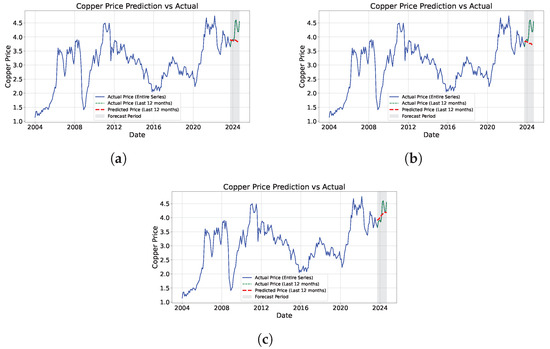 Copper futures prices predicted using LSTM. The red dotted line represents the predictions. The shadowed region denotes the period covered by the forecast. (a) Forecasting copper using the EPUI. (b) Forecasting copper using the VIX. (c) Forecasting copper using the STLFSI.