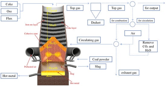 During operation, iron ore, coke, and flux are fed into the furnace top, while preheated, oxygen-enriched air is injected from the bottom. Rising gases react with coke via complex physicochemical reactions, generating reducing agents that convert ore-based iron oxides into molten iron. These gases, after temperature and compositional adjustments, form BF gas as a byproduct. Concurrently, descending raw materials undergo heating, reduction, and melting, ultimately yielding liquid iron and slag through sequential transformations [].