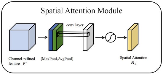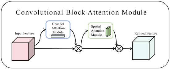The CBAM integrates spatial and channel dimensions to prioritize critical features while suppressing irrelevant information. Following feature map generation by a convolutional neural network, the CBAM derives weight maps from both channel and spatial perspectives, which are then element-wise multiplied with the input feature map to enable adaptive learning. As a lightweight and versatile component, it seamlessly integrates into various convolutional neural networks for end-to-end training [], with its architecture visualized in Figure 2.