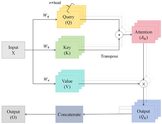 The MSA is a key component of the Transformer architecture, which enables the model to process input data by mapping it into multiple subspaces []. In these subspaces, the model computes feature representations and corresponding attention scores for each part of the input data. This mechanism focuses the model on the most relevant information in relation to the query vectors, improving its ability to handle sequential data. The structure of the MSA is illustrated in Figure 5.