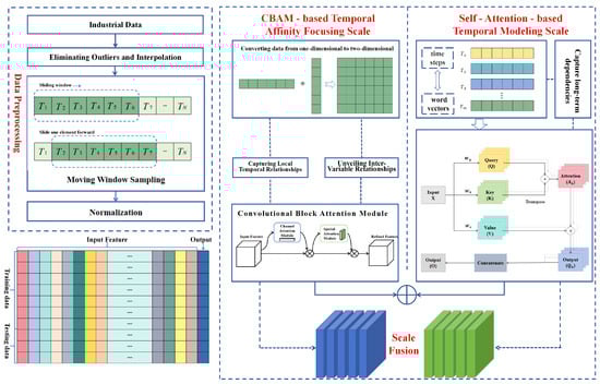 For the above reasons, many methods based on multi-scale feature fusion have been proposed to improve prediction accuracy, proving to be very effective [,,]. For example, Wang et al. proposed a multi-objective convolutional neural network ensemble learning method with multiscale data fusion (MOCNNEL-MSDF) to improve product quality prediction in iron and steel enterprises, addressing the limitations of existing methods by incorporating both macroscopic and mesoscopic data [].