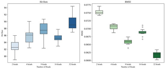In the MSA, the number of attention heads is a crucial hyperparameter that influences the model’s performance. The number of heads controls the number of parallel attention mechanisms, affecting both the model’s ability to express input information and the computational cost. Therefore, tuning the number of heads is key to improving model performance. We trained the model with different numbers of heads and evaluated its performance on the validation and test sets to determine the optimal configuration. Specifically, we compared five different head configurations: 2 heads, 4 heads, 8 heads, 16 heads, and 32 heads. For each configuration, other hyperparameters were kept constant to eliminate potential interference, ensuring the comparability of the results. In each experiment, the model was trained for 50 epochs, and loss values were computed on both the training and validation sets, with performance ultimately evaluated on the test set. The results show that as the number of attention heads increased, the training error, validation error, and test error all gradually decreased, as illustrated in Figure 9. Among all configurations, the model with 32 heads achieved the best performance, with MSE = 0.0625, MAE = 0.25, and HR = 90.1%.