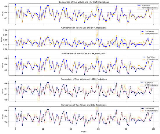 The input data for all models are the same raw time-series data used in the MSF-CNN model to ensure fairness in the comparison. Additionally, the parameter selection and training settings for all comparison models are aligned with those of our proposed model to ensure the comparability of results. Specifically, the SVR model uses an RBF kernel with a penalty parameter C = 1.0 and an error tolerance , with other parameters set to their default values. The LSTM model consists of two LSTM layers, each with 64 hidden units, and uses the Adam optimizer with a learning rate of 0.001, a batch size of 32, and 100 training epochs. A dropout rate of 0.2 is applied as a regularization technique to prevent overfitting. The GRU model follows a similar structure to the LSTM, with two layers of 64 hidden units, and uses the same optimizer, learning rate, and dropout settings. The Random Forest Regression model is configured with 100 trees, a maximum depth of 10, and a minimum sample split of 2.The comparison of the true values and predicted values for different models is shown in Figure 10.