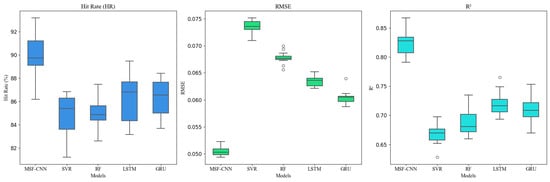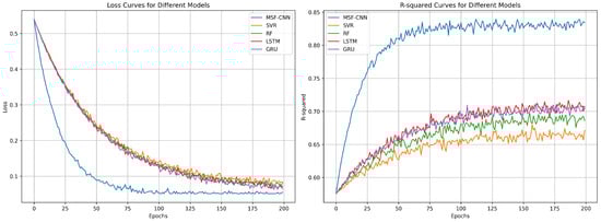 To evaluate the effectiveness and advantages of the proposed model, we compare it against several baseline models commonly used for time-series prediction. These include Support Vector Regression (SVR), LSTM, GRU, and Random Forest Regression (RF) []. Each of these models has distinct characteristics and strengths in handling time-series data, and this comparison offers a comprehensive evaluation of the MSF-CNN model’s performance.