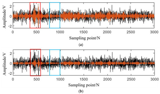In order to eliminate the errors caused by the different preset mode numbers of the two methods, RIME-VMD decomposition of the signal obtained the optimal total mode number of six and then set the total mode number of VMD to six. After the decomposition of the rolling bearing fault signal, it is necessary to screen the effective component and select the effective component reconstruction with useful signal characteristics. The larger the SNR of the modal component, the more likely it is to be an effective component. The SNR of each mode obtained by the VMD algorithm calculated according to the principle of SNR is 7.31, 6.82, 5.44, 5.10, 5.31, and 4.87, and the SNR of each mode obtained by the RIME-VMD algorithm is as follows: 6.27, 8.74, 5.32, 5.46, 5.22, and 4.17. Therefore, VMD selects the first modal component as the effective component. RIME-VMD selects the second mode component as the effective component, and a comparison of the time-domain reconstructed signals of the two methods is shown in Figure 3. Among them, Figure 3a is the result of the time-domain reconstruction of the rolling bearing fault signal by using VMD, and Figure 3b is the result of the time-domain reconstruction of the rolling bearing fault signal by using RIME-VMD; the black line is the original rolling bearing fault signal, and the orange line is the reconstruction signal. The red area represents the rolling bearing signal at a certain moment, the blue area represents the noise signal.