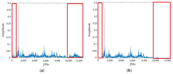 As can be seen from Figure 4a, VMD cannot effectively remove low-frequency noise and high-frequency noise in the red box, resulting in a lot of noise in the rolling bearing fault signal, which makes it more difficult to extract effective fault characteristics in the future. As can be seen from Figure 4b, the RIME-VMD algorithm in this study can effectively solve this problem, not only retaining useful frequencies in the rolling bearing fault signal but also filtering out low-frequency and high-frequency noise. The results show that this method can achieve a better noise reduction in the rolling bearing fault signal.