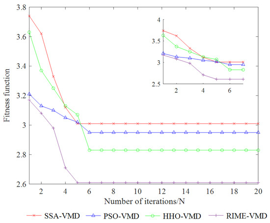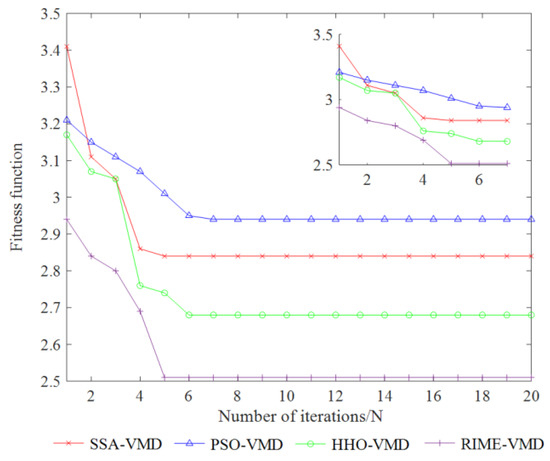 To verify the superiority of the experiment in this study, different swarm intelligent optimization algorithms are used to compare the optimization effects of VMD parameter selection. In order to verify the superiority of RIME in VMD parameter optimization, in this section, four classical optimization algorithms, namely RIME, SSA [32], PSO [33] and HHO [34], are mainly compared in terms of their convergence speed and optimal fitness value in the VMD parameter optimization process.