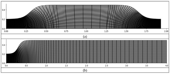 The derivatives included in and are everywhere approximated by central differences. Figure 2 and Figure 3 show the finite difference curvilinear grid constructed by using the described method. This grid is built within the domain characteristic of the boundary problem for the Navier–Stokes equations considered above.