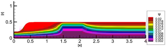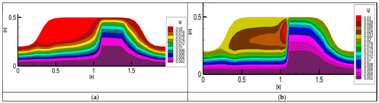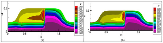 In the Figure 9a,b, the stream function contour lines are shown for , and .