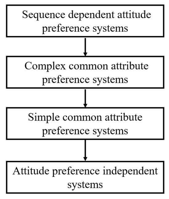 In what follows, we will discuss four types of information systems with regard to attitude preference dependency, and the connections between the four types of information systems are shown in Figure 1, where the system above is a special case of the system below; in other words, the system above can degenerate into the system below.