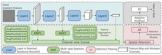 The proposed method is based on the ResNet50 architecture, as shown in the Figure 2. Following Tan et al. [43], we adopt ResNet50 for gradient feature extraction, as their work demonstrated its effectiveness in capturing GAN-specific anomalies across diverse datasets. In this network, the gradient image is applied to the input, and all images are transformed into gradient images. The image is transformed into a gradient image through a transformation model, and the transformation model is defined as . The dataset is defined as ; is the label of the dataset, the real image is set to 0, and the fake image is set to 1. For the gradient computation, we first pass the input images through the model , obtaining an output tensor . We then compute the gradient: