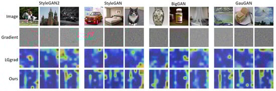 For real images, our method is more effective in focusing on important areas. We can observe that in Figure 6 our heatmaps exhibit a clearer and more concentrated focus, while LGgrad basically covers most of the detection category, but is not concentrated. Our method focuses on key parts, such as the eyes and nose in the face image, which are critical regions, while LGgrad spreads its attention across most of the face without emphasizing the crucial areas. This ability to pinpoint essential regions significantly helps improve the accuracy of forgery detection. Additionally, in the cat image, our method also focuses on the background. We believe this is not an incorrect decision, as our goal is to detect the image’s authenticity. The background, blurred due to the camera’s focus, represents information that might not be accurately reproduced in a forged image. Therefore, by using this background area as supplementary information, the model can more comprehensively assess the image’s authenticity and improve the generalization ability across different images.