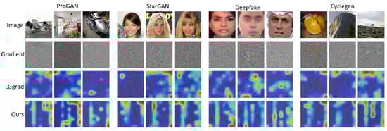 Dataset. We adopt the dataset provided by Tan et al. [43]. The generated images contain content created by eight distinct generative models. The models involved include StyleGAN [34] and StyleGAN2 [35] from the StyleGAN series; BigGAN [32] based on large-scale training; unpaired style transfer models such as CycleGAN [44] and StarGAN [45]; progressively growing model ProGAN [33]; facial manipulation technology Deepfake [17]; and the semantic image synthesis model GauGAN [46]. The real images are curated from LSUN [47], ImageNet [48], CelebA [49], CelebA-HQ [33], COCO [50], and FaceForensics++ [17,46]. The test set consists of 62,003 images, covering all categories generated by the aforementioned GAN models and real images. The training set also contains both real and fake images, but only includes four categories: horses, chairs, cats, and houses. Additionally, the fake images are solely generated by ProGAN. All of these datasets have been processed by gradient transformation.