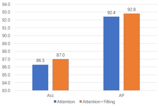 As shown in Figure 7, the proposed AF mechanism significantly improves the performance index of the model. Specifically, the model’s Acc improved from 86.3% to 87.0%, which represents a 0.7% improvement in accuracy. In addition, the average AP is also improved by 0.4%. These data not only demonstrate the effectiveness of our proposed attention-filtering mechanism, but also demonstrate its potential in optimizing model performance.