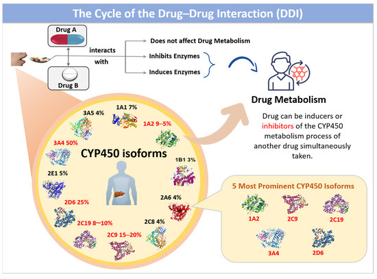 CYP450 inhibitors are substances that inhibit the human cytochrome P450 enzymes, playing a vital role in pharmacology and medicine by affecting drug metabolism. These enzymes, part of the hemoprotein superfamily, consist of 57 isoforms located in hepatic cells, and their metabolic interference often results in adverse drug reactions, such as acute side effects and metabolic malfunctions, including drug–food and drug–drug interactions. Drugs that inhibit CYP450 isoforms can raise the plasma levels of other drugs metabolized by the same isoform [8]. For example, the strong CYP3A4 inhibitor Ketoconazole can significantly increase the levels of CYP3A4 substrates, potentially leading to toxicity. On the other hand, enzyme inducers enhance the expression and activity of CYP450 enzymes, lowering the plasma concentration of drugs metabolized by the induced enzyme [9]. For instance, rifampicin, an inducer of CYP3A4, can diminish the effectiveness of drugs like oral contraceptives and immunosuppressants. Figure 1 illustrates the cycle of drug–drug interactions (DDIs) that occur when drugs are taken concurrently, highlighting the indispensability of CYP450 isoforms in drug metabolism.