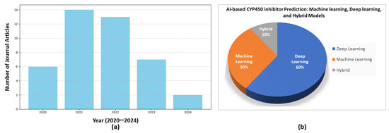 A recent literature survey examined published research on AI-based predictions of CYP450 inhibitors. Part (a) presents an annual summary of the articles, while part (b) displays the distribution of articles based on the AI approach used for prediction, categorized into machine learning, deep learning, and hybrid AI models. These data were collected from the Google Scholar database from 2020 to 2024.