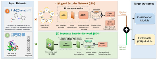 Despite recent advances, current black-box architectures like deep neural networks lack interpretability when it comes to understanding the contribution of specific input features, such as ligand SMILES strings and protein sequences. These models often treat inputs as undifferentiated vectors or tokens, making it difficult to ascertain which molecular substructures of the ligand or which amino acid residues of the protein are most critical for determining their interaction. In a ligand SMILES string, some atomic subgroups (like functional groups or rings) may be essential for binding affinity, but standard models rarely highlight their individual influence. Similarly, within a protein sequence, certain domains or conserved motifs might play a crucial role in drug binding, yet these regions often receive no special attention in conventional models. This lack of interpretability limits the model’s ability to provide mechanistic or biologically meaningful insights, which are critical for rational drug design and understanding off-target effects. Incorporating attention mechanisms, feature attribution methods (like SHAP or integrated gradients) or graph-based interpretability frameworks could enhance our ability to pinpoint influential regions within both compounds and targets, thus bridging the gap between prediction performance and biological understanding. Thus, we examine the problem of predicting the class of ligands, whether they are inhibitors of the CYP450 isoform, given the ligand compound and the CYP protein target. In this paper, we identify the SMILES of a compound and the target sequence as the “primary” structures of these entities. These primary forms of the compounds and targets cannot be used for virtual screening (VS) experiments until they are quantized to mirror their intrinsic structural or physicochemical components. To reduce the generalization loss of deep learning models, these properties must be properly represented. In this work, we will sometimes refer to the molecular graph as ligand graphs since it is a more relatable term when it comes to compound and protein target interactions. Mapping atoms and bonds into sets of nodes and edges is the fundamental step in graph representation. It is also important to note which features of the graph had the most influence on the results. This approach enables the identification of the molecules’ inhibitory states while also providing in-depth insights into the specific atoms that contribute most to the predicted outcomes. In our prospective study, this task is achieved using the proposed two-stage attention mechanism. The first stage of attention, comprising the Joint Local Attention Module (JoLA) and the Attentive GIN module, processes the nodes and edges of the ligand graphs collected from the PubChem database. The second stage of attention uses the Self-Attention module applied to process the protein sequences obtained from the Protein Data Bank (PDB) Database. The major contributions presented in this study include.