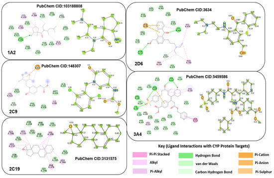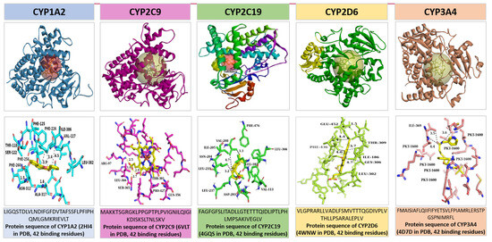 PDB contains structures for proteins from a wide range of organisms, including humans, model organisms (e.g., mice, yeast), bacteria, viruses, and plants. Each PDB entry provides detailed information about the sequence, including the chain identifier(s) corresponding to the protein(s) in the structure, sequence length, and sometimes annotations regarding domains, functional sites, and mutations. The sequence diversity among CYP450 enzymes is considerable, reflecting their adaptation to metabolize a wide range of substrates. We obtained the protein sequences for CYP1A2 (PDB ID: 2HI4), CYP2C9 (PDB ID: 6VLT), CYP2C19 (PDB ID: 4GQS), CYP2D6 (PDB ID: 4WNW), and CYP3A4 (PDB ID: 4D7D) from the PDB database, as illustrated in Figure 4. Simulations were conducted using the BIOVIA Discovery Tool (v2024) [34] and PyMol software (v3.0.3) [35]. Distances within 5 angstroms of the CYP450 protein targets are indicated with dashed lines (second row). The sequences of each isoform were derived from the chain A sequence of each CYP450 protein. The second row of Figure 4 depicts the key binding residues for each of these 5 isoforms labeled using the IUPAC’s [36] (amino acids or protein codes used in bioinformatics) three-letter notation of the protein residue name. For example, Leucine and Alanine are represented as LEU and ALA, respectively. Following [23], we adopted IUPAC’s one-letter representation of these protein residue names in our experimentation. For Leucine and Alanine, their one-letter notation is represented as L and A, respectively. Each of the 42 binding residues for each isoform is provided in the third row beneath its respective protein target.