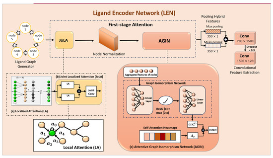 As shown in Figure 5, the Ligand Encoder Network (LEN) was processed using the Joint-localized Attention (JoLA) module to obtain the most relevant node features. These features were then standardized using a normalization technique before being processed by the Attentive Graph Isomorphism Network (AGIN). This was followed by a hybrid pooling layer (i.e., parallel max and mean pooling) to capture the salient high-level features from the ligand graph input dataset. The concatenated output was then processed with two convolution layers to produce the final output for the LEN. A dropout rate of 0.3 was empirically used in both convolutional layers to reduce trainable parameters, regularize the model, and make the AI model more efficient. The output feature of the LEN is derived as