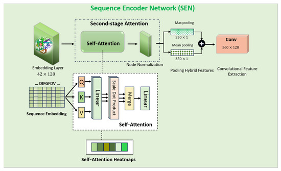 where is the output derived from the SEN, SEN is the Sequence Encoder Network and is the sequence input. Normalization helped to prevent information loss during the self-attention process. By applying a convolution on self-attention output, the model can further extract local features from the protein sequence, complementing the global information captured by self-attention.