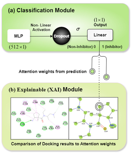 The classification module receives the concatenated output from the LEN and SEN as input. Figure 7 shows the classification module and its corresponding explainable module. We elaborate on the explainable module in subsequent sections. Using multi-layer perception (MLP), non-linear activation, dropout, and a sigmoid-transformed linear layer output, the classifier module makes predictions to distinguish ligands that are inhibitors and those that are not. By using both ligand and protein data, the classification module captured the interaction, specifically how a particular ligand interacts with a specific protein target. This specificity is crucial because inhibitory activity is not just a property of the ligand alone but is highly dependent on the protein target.