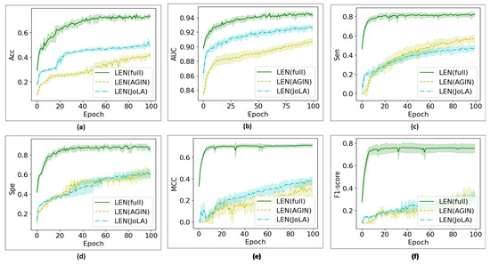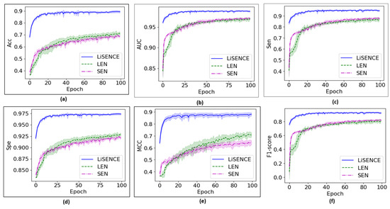 Figure 8 shows the convergence of the proposed LEN against its individual components over 100 training epochs. Meanwhile, Figure 9 shows the convergence of the proposed LiSENCE against the individual network LEN and SEN. The training performance is presented as line plots, and the shaded region around the line plots indicates the standard deviation, which provides a thorough understanding of the variability of each plot.