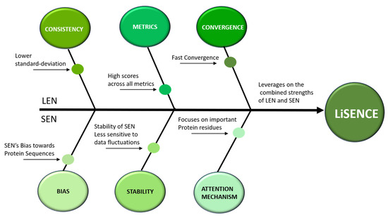 From the confusion matrix of the SEN, shown in Figure 11a, several misclassifications are evident. The SEN achieved the lowest scores in comparison to the LEN and LiSENCE. These misclassifications may stem from the SEN’s bias towards protein sequences, with less focus on ligands. The few misclassifications of LiSENCE arose from the close similarity of features among samples from different classes, which may interfere with the model’s ability to discern subtle feature differences accurately. LiSENCE capitalizes on the combined features from both the LEN and SEN, leveraging each model’s strengths to improve classification accuracy. This multimodal approach helps reduce both FP and FN to 50 and 47 cases, respectively. The synergy between insights from both modules captures complex patterns and relationships that may be overlooked by either model alone, resulting in enhanced overall predictions. Figure 14 shows the cause-and-effect summary of the performance of LiSENCE and its sub-models.