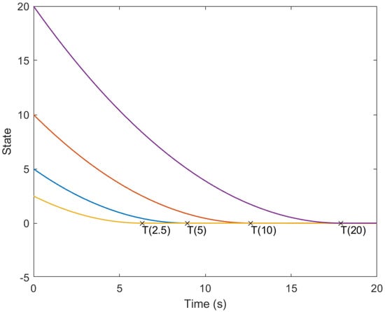 In this example, we show the stark difference in the conservatism of the settling time bound estimate between our fixed-time stability result and the results of [7,13]. To see this, we consider the scalar nonlinear system (6) given in Example 1 and we first consider the case where , , and , which results in a finite-time stable system. Figure 1 shows the solutions versus time for different initial conditions and clearly shows that the settling time function increases as the initial conditions increase.