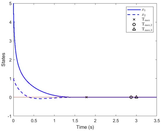 Figure 3 and Figure 4 show the closed-loop system trajectories and the control input versus time along with the settling time bound estimate for each result. Note that Theorem 2 provides a less conservative estimate for the settling time bound than predicted by [7,13] with the same control effort.