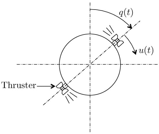 To demonstrate the use of Theorem 2 for fixed-time stabilization, consider the rigid satellite shown in Figure 5. The satellite is assumed to be in a frictionless environment and rotates about an axis perpendicular to the page. A torque , , is applied to the satellite by firing the thrusters shown in the figure resulting in the equation of motion , where , J is the mass moment of inertia of the satellite, is the angular rotation in rad, is the angular velocity in rad/s, and and are the initial conditions. Taking and , and setting the dynamics can be written in the state space form as